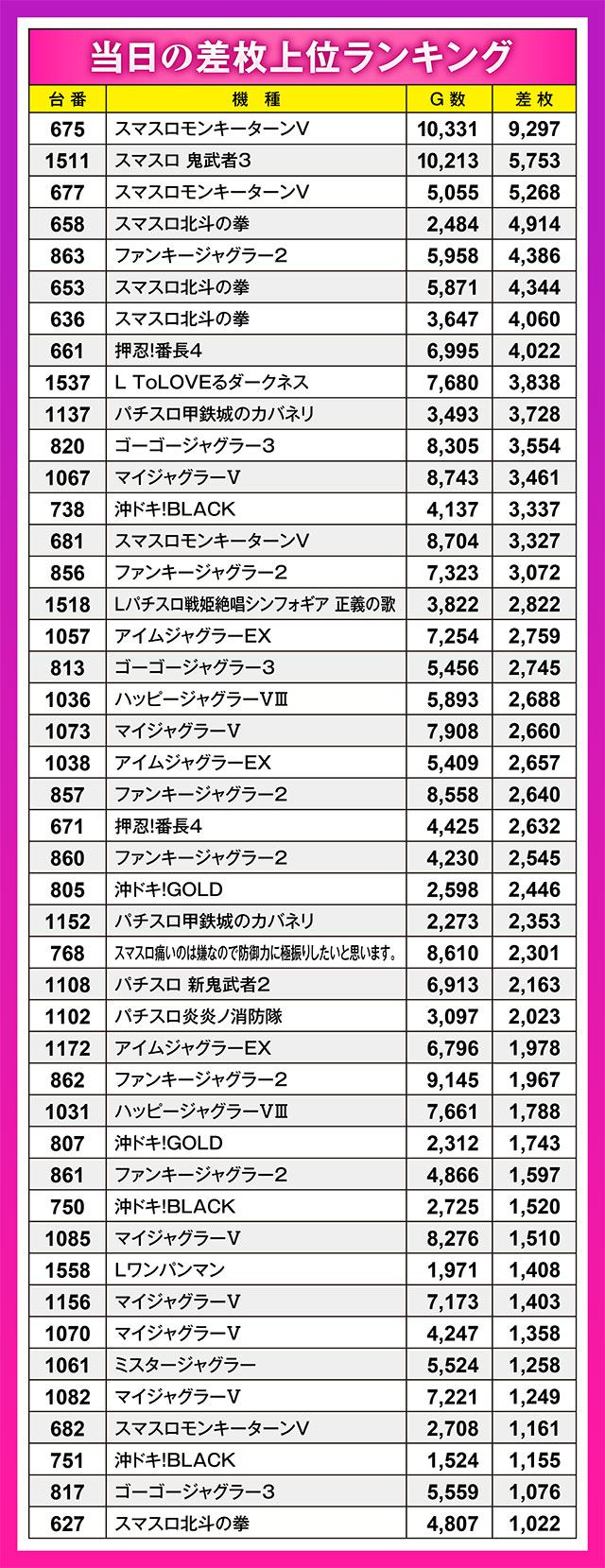 9,000枚オーバーという文句なしの記録で、この日のTOPスコアを叩き出したのは『スマスロモンキーターンV』。10台設置の同機は、4台がTOP45にランクインを果たした。また、今回も例に漏れず、『ジャグラー』シリーズから多くのプラス差枚が生まれており、常連ユーザーたちの期待にしっかり応えた形となった。