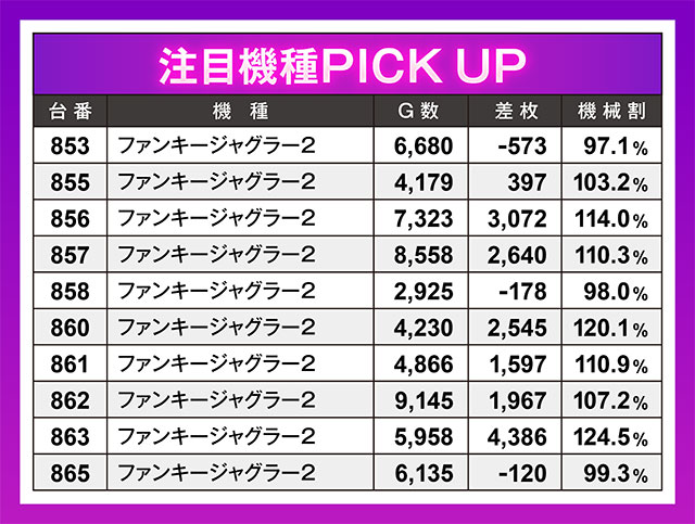 全10台設置の『ファンキージャグラー2』は勝率が高く、マイナス台は3台のみ。その3台のマイナス値も誤差レベルのものばかりだった。さらに10台中6台が1,500枚を上回っており、シマ状況がこれ以上ないほど理想的な環境だったのは間違いないだろう。