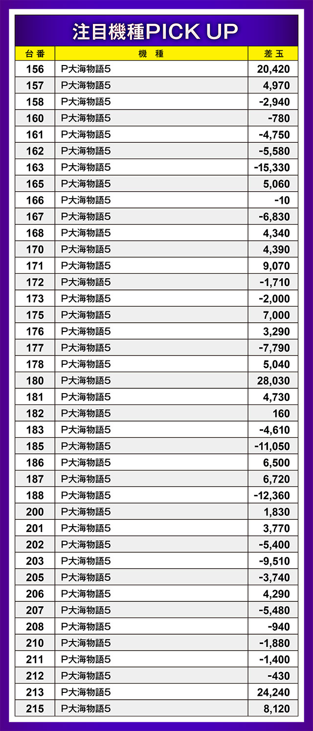 今回は全40台設置の『P大海物語5』コーナーの動向を調査。約半数の台がプラスとなっていた同機、トータル差玉は当たり前のようにプラス値に。さらに20,000玉オーバー記録が3台も出現するなど、人気に比例した結果となっていたようだ。