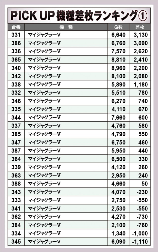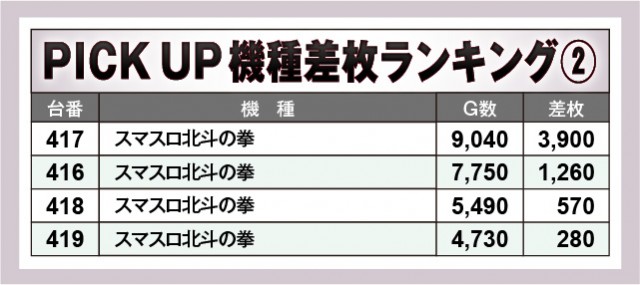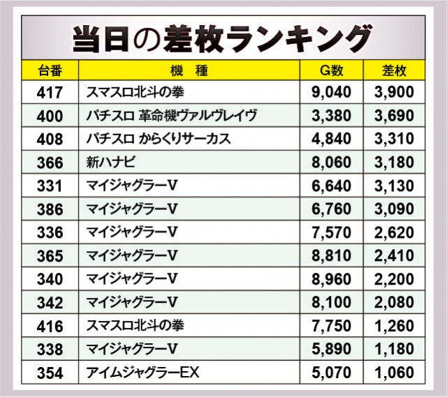 『マイジャグラーⅤ』『スマスロ北斗の拳』は特にファンからの支持を集め、優秀機種として存在感をアピールしていたと言える。特に注目したいのが回転数の多さで、特に後者は開店から閉店まで打ち込まれた形跡を確認できる。9,000回転OVERという事実から相応の手応えを窺うことができ、それは全台に言えることだろう。明らかな好感触を得ては、口角を緩めながらレバーを叩いていたに違いない。