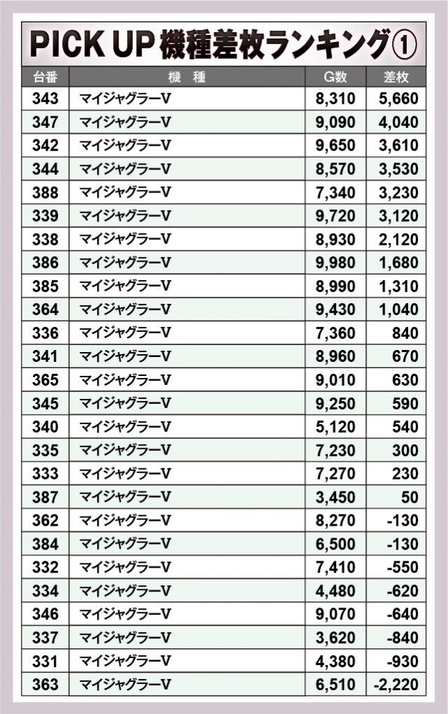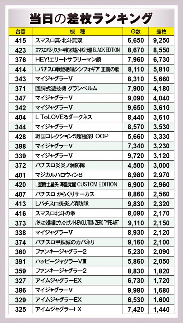 『マイジャグラーⅤ』全26台は店内の盛り上がりをリードする存在となり、その様子は上表が如実に表している。343番台+5,660枚と大きな熱量を披露すれば、さらにまとまった出玉を確保する台が多く見られた。一方で『スマスロ真・北斗無双』『スマスロバジリスク~甲賀忍法帖~絆2 天膳 BLACK EDITION』とスマスロ勢の熱気も凄まじく、30周年という大きな節目は盛大に祝われたようだ。