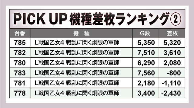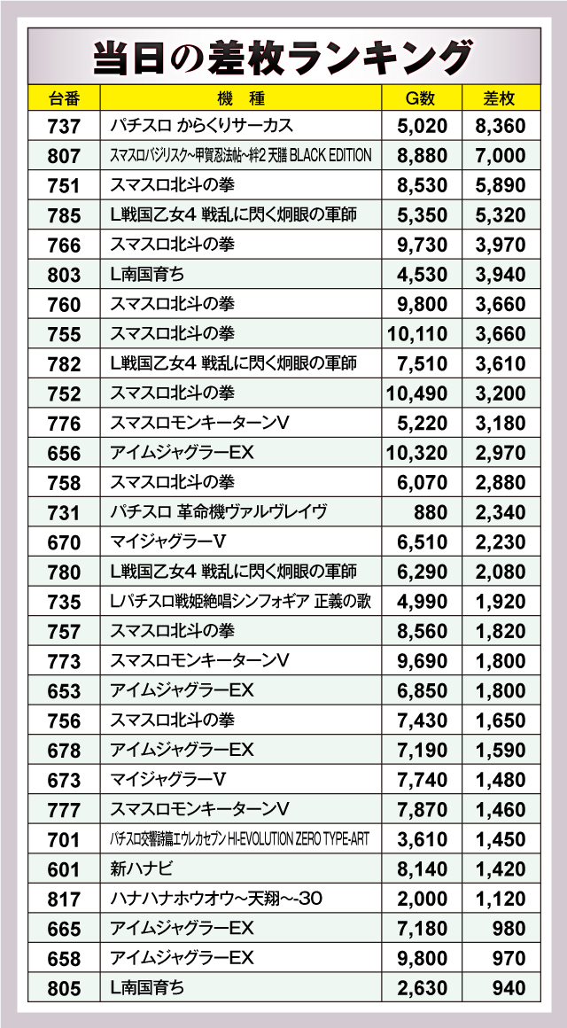 『パチスロ からくりサーカス』が+8,360枚のビッグヒットを記録し、この日のトップに。さらに『スマスロバジリスク~甲賀忍法帖~絆2 天膳 BLACK EDITION、『スマスロ北斗の拳』、『L戦国乙女4 戦乱に閃く炯眼の軍師』が大台を越え、ホールの盛り上がりを牽引していた!