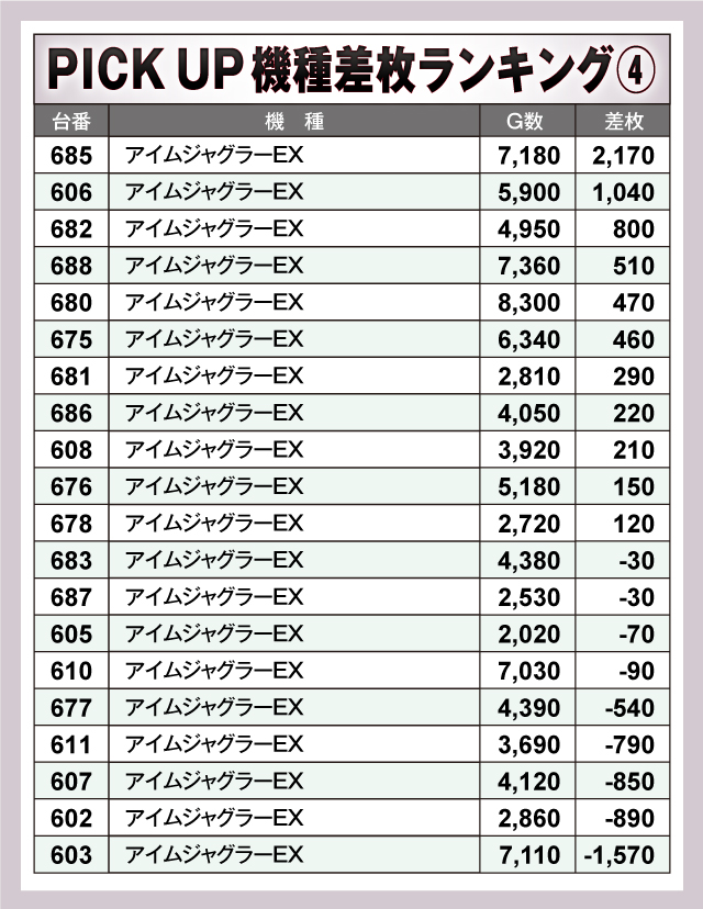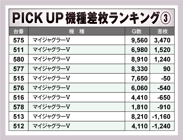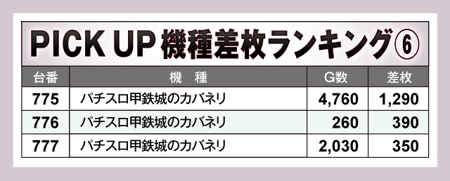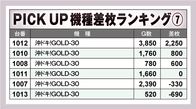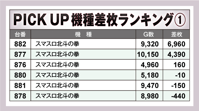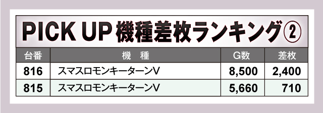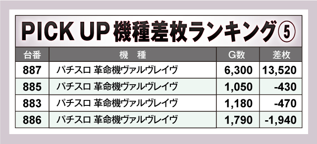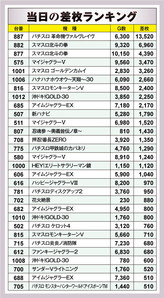 まずは差枚トップ30のご紹介から。この日のトップは万枚OVERを達成した『パチスロ 革命機ヴァルヴレイヴ』! そのポテンシャルを存分に発揮し、+13,520枚の大ヒットを記録した。また『スマスロ北斗の拳』が+6,960枚・+4,390枚でそれに続き、膨大な熱量でファンの視線を集めていた。