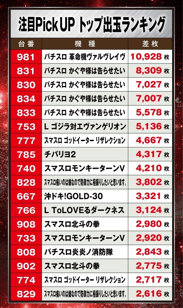 この日はなんといっても『パチスロ かぐや様は告らせたい』が大活躍!! ランキングトップは万枚超を達成した『パチスロ 革命機ヴァルヴレイヴ』に譲ったものの、831番台の+8,309枚を皮切りにベスト5をほぼ占拠する活躍を見せていた。