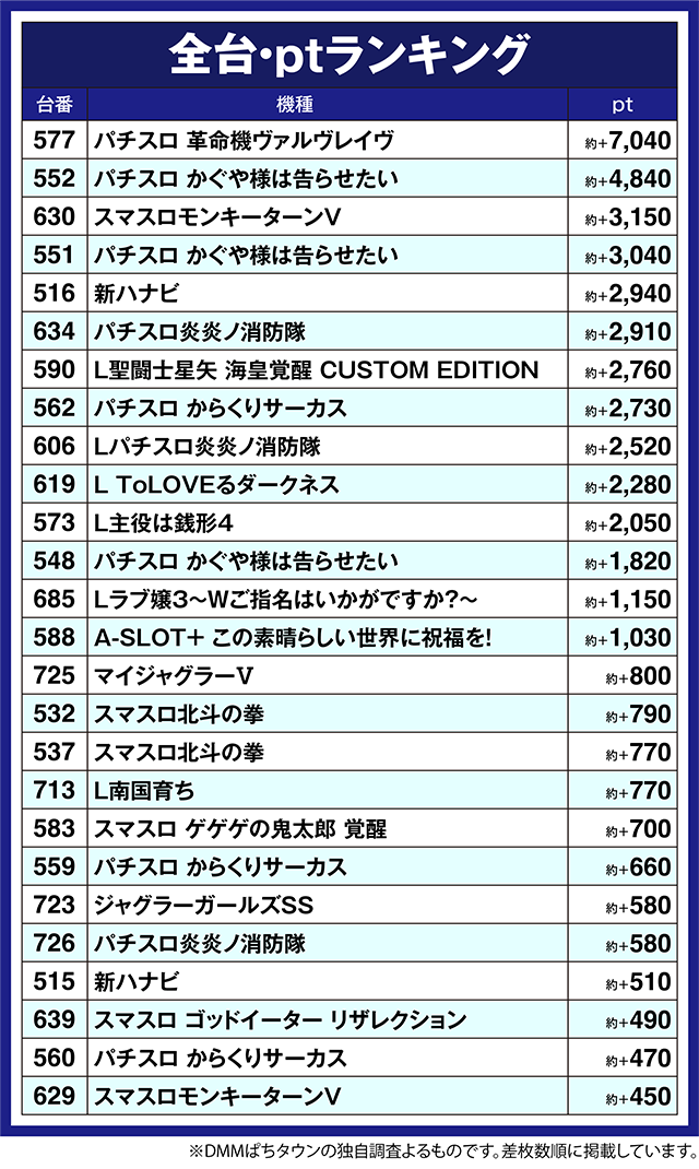 ほかにも、「スマスロモンキーターンV」の630番台は約+3,150pt、「新ハナビ」の516番台も約+2,940ptと、多彩な機種に結果を残した台があった。
