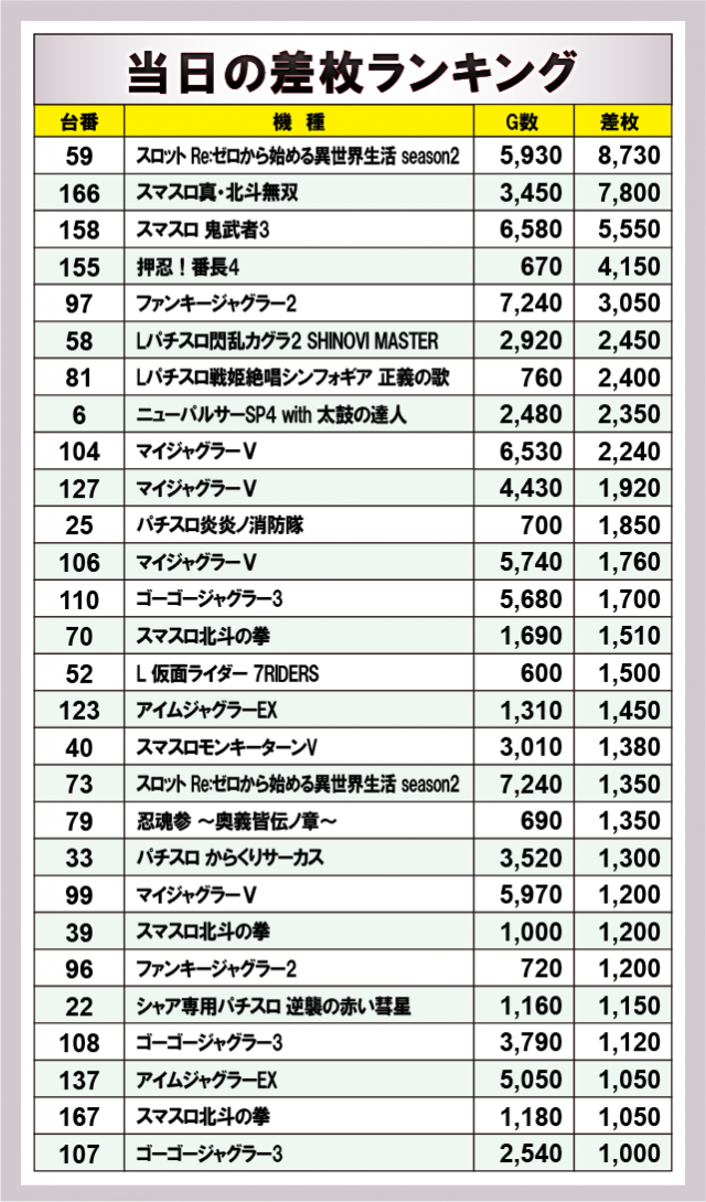 『スロット Re:ゼロから始める異世界生活 season2』『ファンキージャグラー2』『ゴーゴージャグラー3』『スマスロ北斗の拳』から4桁プラス台が複数台発生。最新台や定番人気機種たちを筆頭に活気と熱気に包まれていた様子が窺える内容となった。