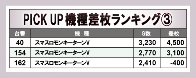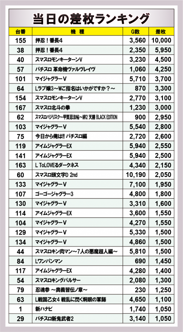 当日の差枚ランキングを見てみると、『押忍!番長4』から+10,000枚を記録し、ホール内を存分に盛り上げていた。 また、後述する3機種以外の好調台としては、『パチスロ 革命機ヴァルヴレイヴ』で+4,250枚、『Lラブ嬢3〜Wご指名はいかがですか?〜』で+3,300枚、『スマスロ北斗の拳』で+3,000枚と、幅広いラインナップにハイスコアが窺えた。