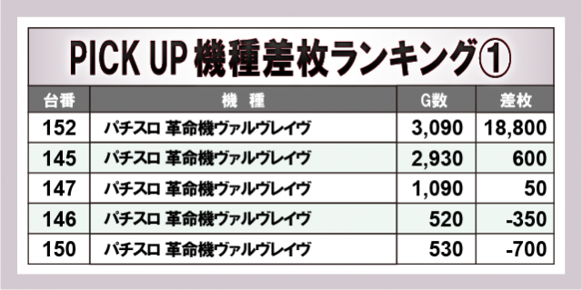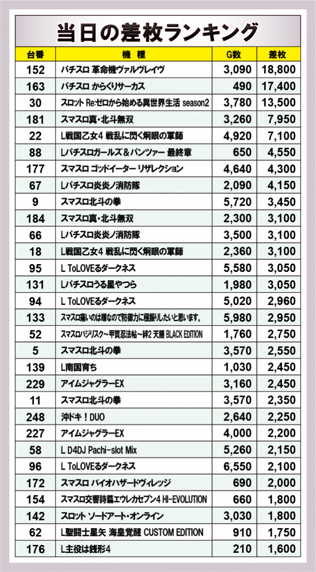 万枚OVERを達成した優秀機種も確認でき、上表から窺えるのは、これら機種が中心となって店内の盛り上がりをリードしていたという点だ。その中で『スマスロ真・北斗無双』『L ToLOVEるダークネス』は全台プラス差枚数を達成しており、遊技していたファンは自信を持ってレバーを叩いていたことだろう。スマスロ機を中心に幅広い機種にチャンスが眠っていたと言っても過言ではなく、同店の高い実力を感じられる内容となっている。