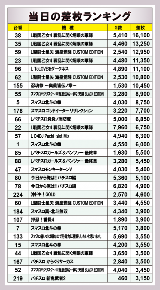 なんと言っても注目すべきは『L戦国乙女4 戦乱に閃く炯眼の軍師』で、万枚OVERが3台発生するという大盛況ぶり!さらに『L聖闘士星矢 海皇覚醒 CUSTOM EDITION』からも2台の万枚OVER、そのほか『スマスロ北斗の拳』『スマスロバジリスク~甲賀忍法帖~絆2 天膳 BLACK EDITION』『忍魂参 ~奥義皆伝ノ章~』から多数の優秀台が発生し、ファンは期待感を抑えきれずにレバーを叩いていた姿が安易に想像できる。