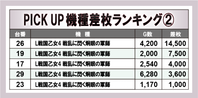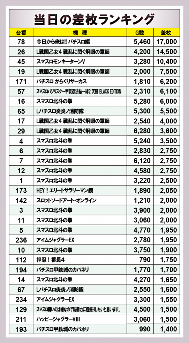 上表をご覧の通り、『今日から俺は!! パチスロ編』『L戦国乙女4 戦乱に閃く炯眼の軍師』『スマスロモンキーターンV』から万枚OVERが発生!さらに『パチスロ からくりサーカス』『スマスロバジリスク~甲賀忍法帖~絆2 天膳 BLACK EDITION』『スマスロ北斗の拳』といったスマスロ機が上位を占める中、『ジャグラー』シリーズや『パチスロ甲鉄城のカバネリ』などメダル機も奮闘しており、各所でファンが手応えを感じていた様子が窺えた。