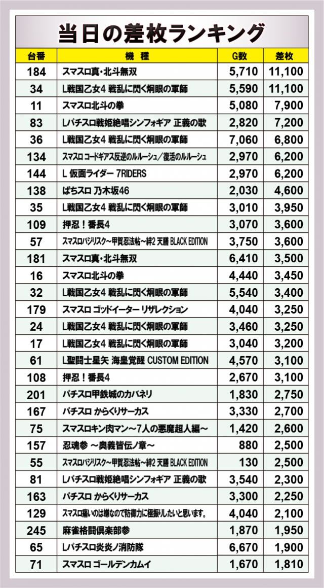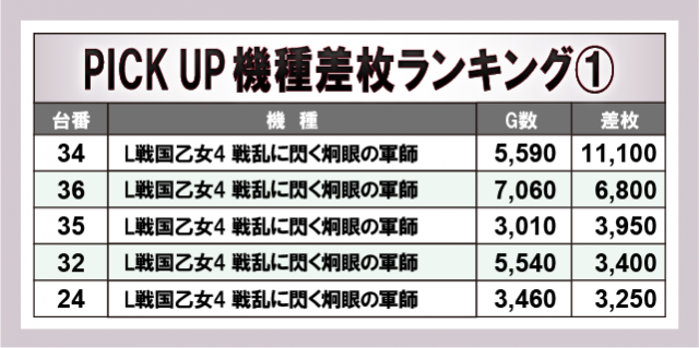 続いて注目機種を見ていこう。上表のスマスロ4機種から好調ぶりが炸裂しており、『スマスロ真・北斗無双』『L戦国乙女4 戦乱に閃く炯眼の軍師』の万枚OVERを筆頭に、多くの4桁プラス台が発生!遊技するファンが競い合うかのようにレバーを叩いていたのが印象的だ。