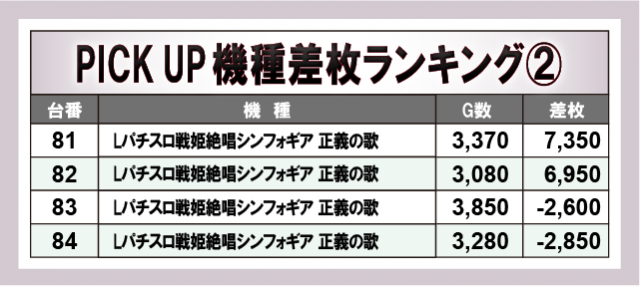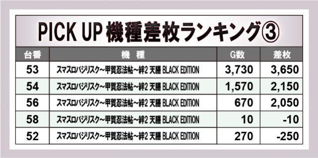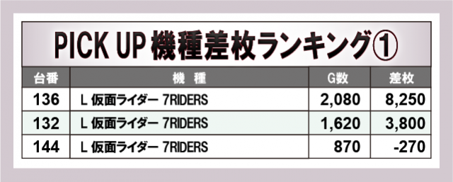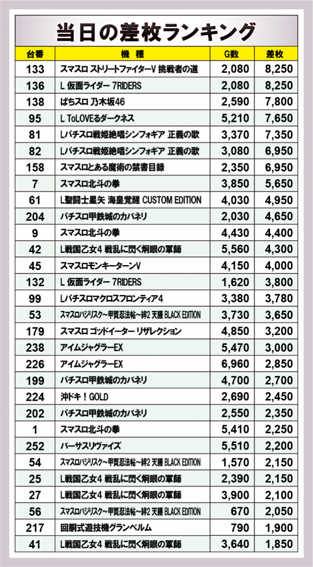 優秀機種として名を連ねた5機種は、打ちごたえのある状況が整っていたことから、館内の盛り上がりに大きく貢献していたと言える。いずれも、差枚数プラス4桁を複数輩出しており、多くの台が可能性を秘めていたようだ。
