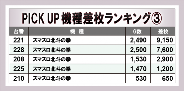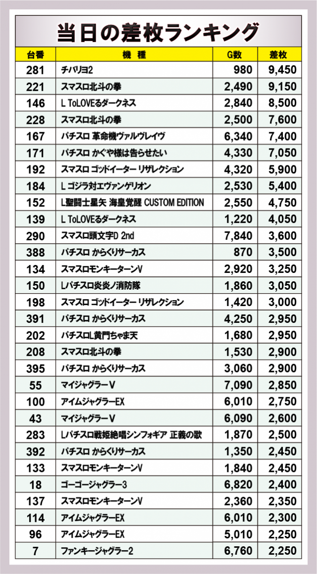 今回は万枚OVERという派手なパフォーマンスはないものの、『チバリヨ2』『スマスロ北斗の拳』から+9,000枚OVERが発生!さらにTOP30台は+2,000枚OVERからとなっており、『ジャグラー』シリーズも複数ランクインしていることから、各所で大きな熱気が放たれ、その結果としてあらゆる台で終日を通して打ち込まれたようだ。