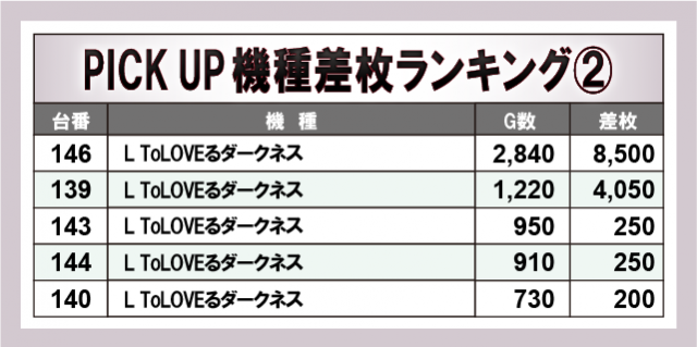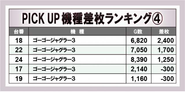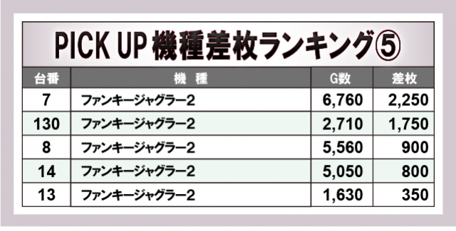 店内では注目すべき機種が多数見受けられた。特に上表の5機種は、いずれも差枚数プラス4桁を複数輩出しており、多くの台で可能性を秘めていたことが分かる。打ちごたえのある状況が整っていたことから、館内の盛り上がりに大きく貢献していたと言えるだろう。