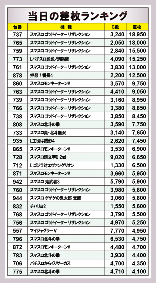 上表をご覧の通り、当日は6台の万枚OVERが生まれている。人気のスマスロ機を中心に名を連ねているわけだが、なかでも『スマスロ ゴッドイーター リザレクション』は、複数台がランクインするという凄まじい熱量で注目を集めていた!また、トップ30台は+4,000OVERからとなっており、随所で見どころのある展開が繰り広げられていたようだ。