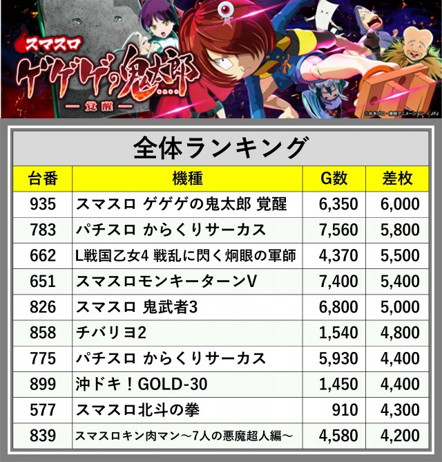 厳選された取材対象機種をはじめ、その他スロット全体から好記録が飛び出した!プレイヤーが楽しんだ1日を下記データにて振り返ってみて欲しい。