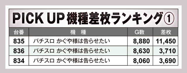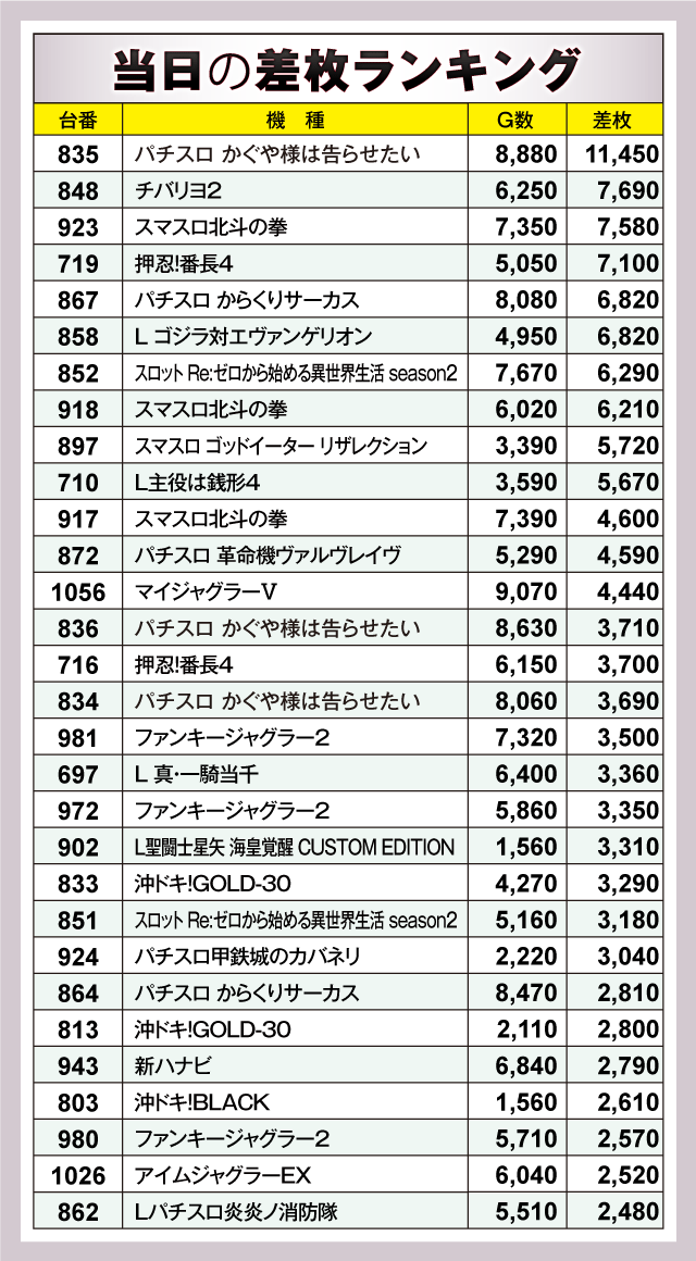 この日は、人気のスマスロを中心に+5,000枚超の台が大量発生!! そんな中、ランキングトップに輝いたのが『パチスロ かぐや様は告らせたい』で+11,450枚という圧巻の結果を残している。