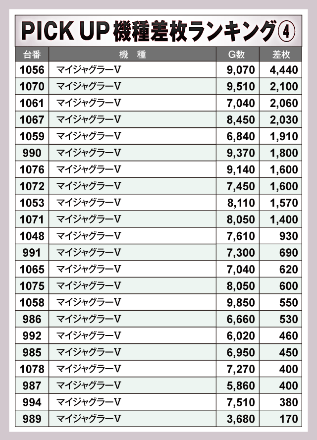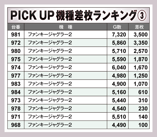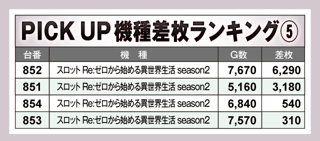 次にPICK UP機種を見てみると、ランキング1位になった『パチスロ かぐや様は告らせたい』は残りの2台も+3,000枚超と大健闘、さらに、導入直後の新台『スロット Re:ゼロから始める異世界生活 season2』からも+6,000枚超が飛び出している。そして、お店の看板機種とも言えるジャグラーシリーズもプラス域で終了した台が続出しているだけに、ファンも大満足だったに違いない。