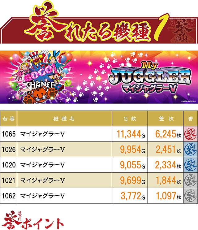『マイジャグラーⅤ』からは5台の誉マーキングが出現。注目は奇跡的なボーナス連打で6,000枚オーバーを達成した1065番台。AT機も真っ青なこの記録に、ジャグファンたちも驚いたことだろう。