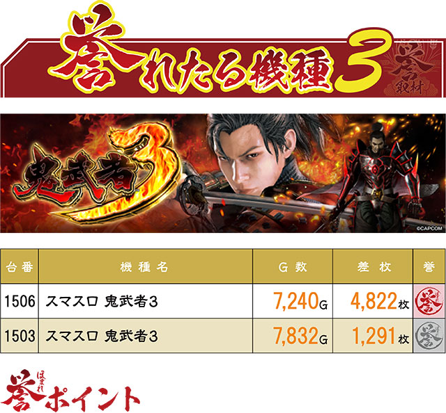 導入されて間もない新台ということで注目を集めていた『スマスロ 鬼武者3』。なんと導入された3台ともがプラスだったばかりか、2台が誉マークに。今後も注目すべき機種になりそうだ。