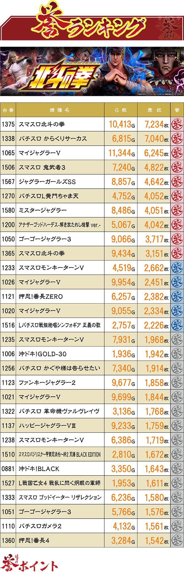 この日のTOPスコアを飾ったのは『スマスロ北斗の拳』。『パチスロ からくりサーカス』との接戦を制し、首位の座を獲得することとなった。また4位には導入されたばかりの新台『スマスロ 鬼武者3』がランクインしている反面、『アナザーゴッドハーデス-解き放たれし槍撃 ver.-』や『パチスロ ガメラ2』などのやや古めの機種もしっかりランクイン!
