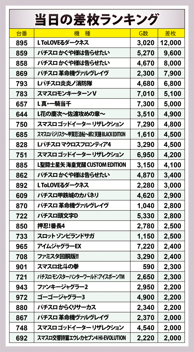 下に記す4機種以外の好記録として欠かせないのは『L ToLOVEるダークネス』859番台がマークした+12,000枚超で、この日のナンバーワンに輝いた。