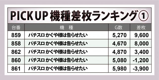 『パチスロ かぐや様は告らせたい』5台ではビッグヒットが続出。+9,600枚超・+8,000枚超・+3,400枚超と重量級の出玉がひしめき合っていた。