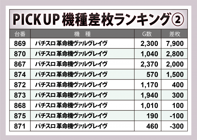 『パチスロ 革命機ヴァルヴレイヴ』9台も負けていない。7台がプラスとなり、+7,900枚超を筆頭に+2,000枚超×2と続いた。