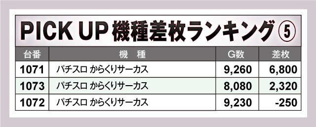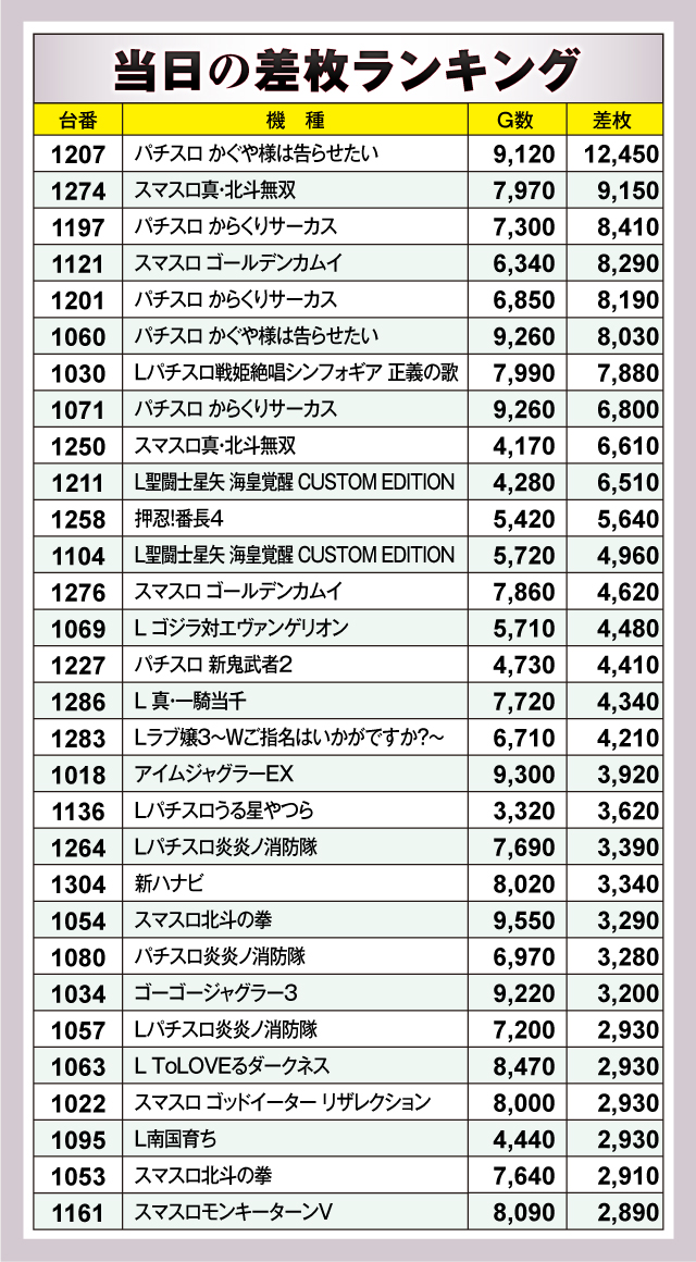 まずは当日の差枚ランキングを紹介していこう。30台すべてが差枚+2,000枚オーバーで、+5,000枚オーバーは11台出現。それらのなかでもっとも優秀だった台は、1207番台の「パチスロ かぐや様は告らせたい」で、差枚は大台突破の+12,450枚を獲得! その他ランクイン機種を見渡すと、人気の「スマスロ北斗の拳」を中心に、多種多様な機種がランクイン。機種ごとにチャンスが隠されていたようだ!