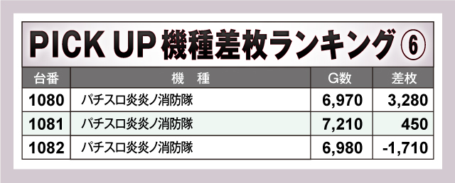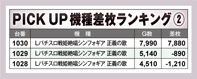 続いては、当日店内を大いに盛り上げた機種たちをチェックしていこう。今回ピックアップしたのは10機種で、そのうちの8機種はすべてが並びで好調だったものたち。そのほとんどが並びトータルでプラスを達成しており、とくに1051番台〜1055番台の「スマスロ北斗の拳」の5台並びは、4/5台がプラス終了で、そのうち2台が+2,000枚オーバーと圧巻の成績! 店内のあらゆる機種にチャンスがあったのが窺えた!