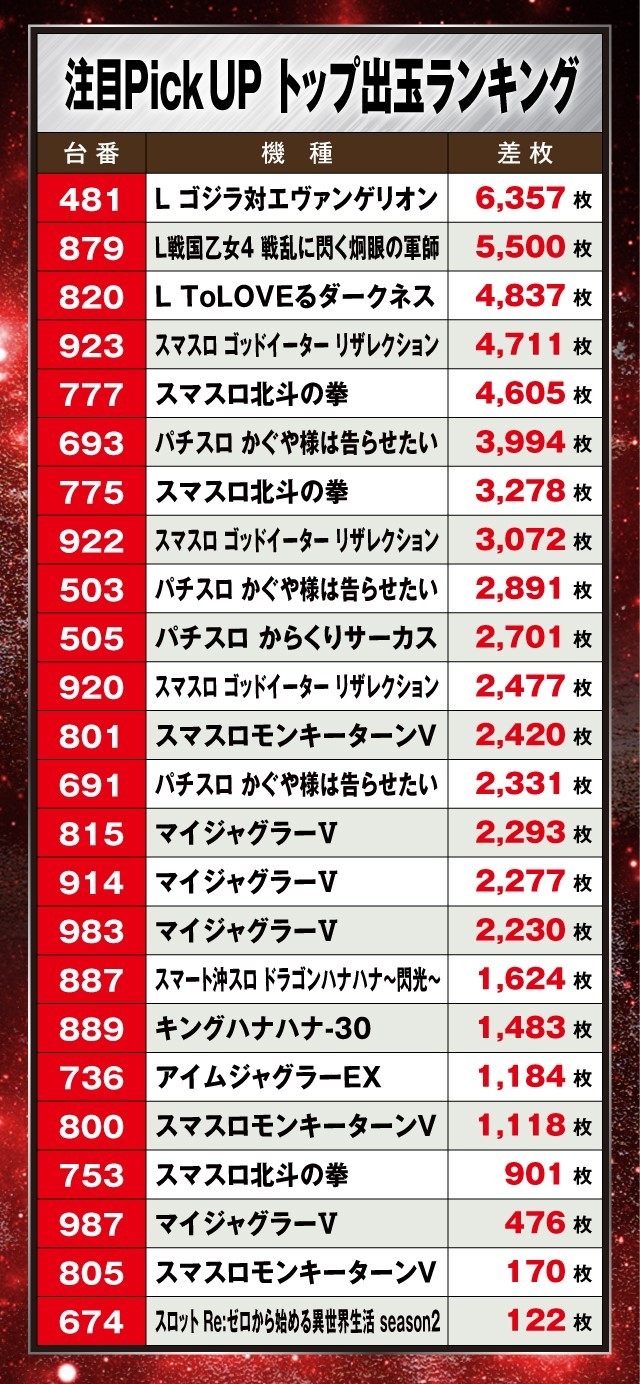 この日も様々な機種で好調台を確認、そんな中『L ゴジラ対エヴァンゲリオン』が+6,357枚を叩き出しランキングトップに。次いで『L戦国乙女4 戦乱に閃く炯眼の軍師』が+5,500枚、『L ToLOVEるダークネス』が+4,837枚を記録し店内を盛り上げていた。