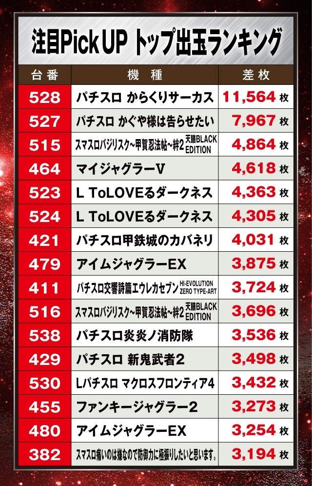 この日、ランキングトップに輝いたのは『パチスロ からくりサーカス』で、万枚超の+11,564枚の叩き出し店内を盛り上げていた。また、その他の機種では『パチスロ かぐや様は告らせたい』が+7,000枚超、『L ToLOVEるダークネス』で+4,000枚超が2台という好成績を残している。