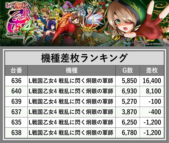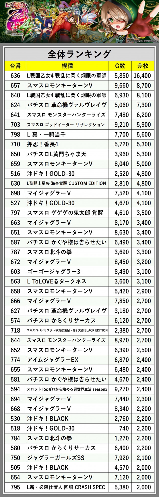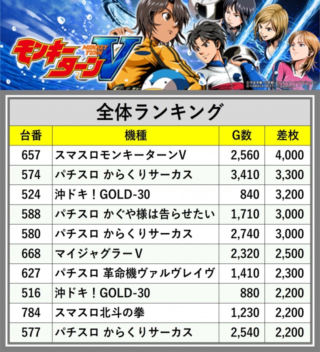 ※差枚数順に掲載しています