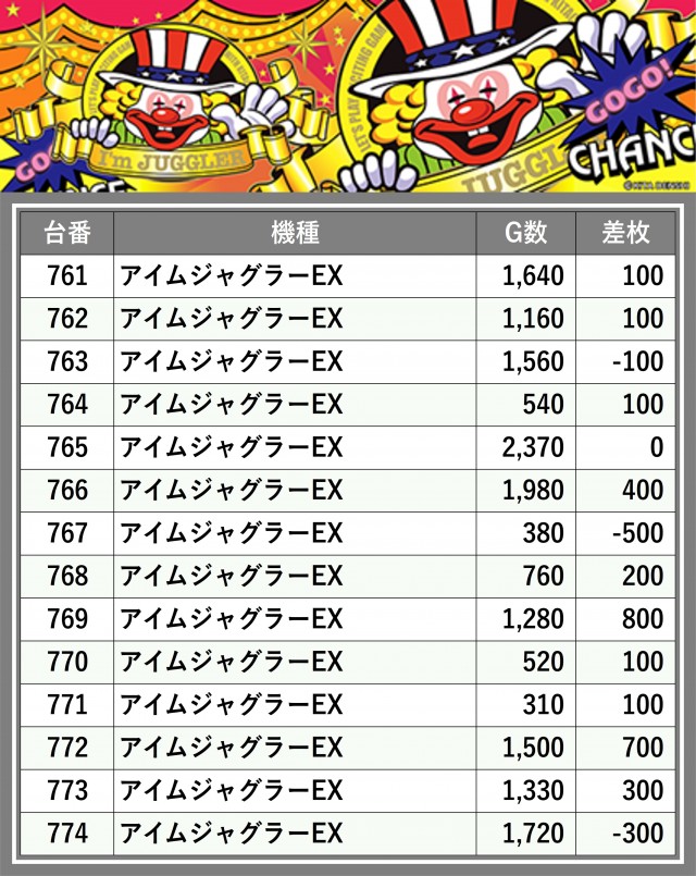 厳選された取材対象機種をはじめ、その他スロット全体から好記録が飛び出した!プレイヤーが楽しんだ1日を下記データにて振り返ってみて欲しい。
