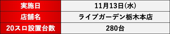 11月13日(水)ライブガーデン栃木本店にて、DMMぱちタウンの新感覚取材「スロセレ」を実施。