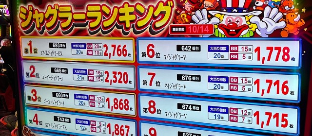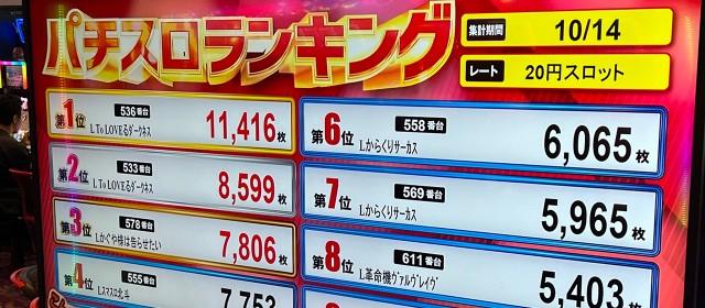その他、『パチスロ かぐや様は告らせたい』では+9,400枚弱・+5,400枚超・+5,000枚弱が1台ずつ、『パチスロ からくりサーカス』では+8,500枚超・+5,100枚超・+4,200枚弱が1台ずつ、『スマスロモンキーターンⅤ』の+4,300枚超、『Lパチスロ炎炎ノ消防隊』の+4,200枚超、『ゴーゴージャグラー3』の+4,000枚弱と、どのホールでも人気の高いマシンが実力を発揮した。