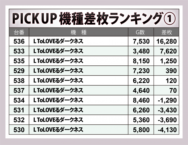 1回目でも万枚達成台を輩出した『L ToLOVEるダークネス』ではこの度でも同様。536番台が+16,200枚弱で全338台の頂点に輝いたのに加え、+7,600枚超の台が続いた。