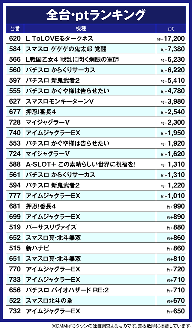 「スマスロ ゲゲゲの鬼太郎 覚醒」は、584番台が約+7,300ptを上回った。
