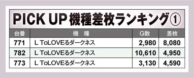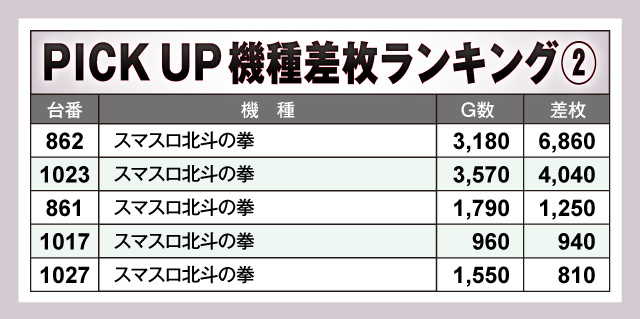 まずは当日の差枚ランキングからご紹介。上位の『スマスロ痛いのは嫌なので防御力に極振りしたいと思います。』と『L ToLOVEるダークネス』の2台が+8,000枚OVERの素晴らしい結果を残し、さらに『スマスロ北斗の拳』も+6,000枚OVERと見事な成績で盛り上がりを見せていた!