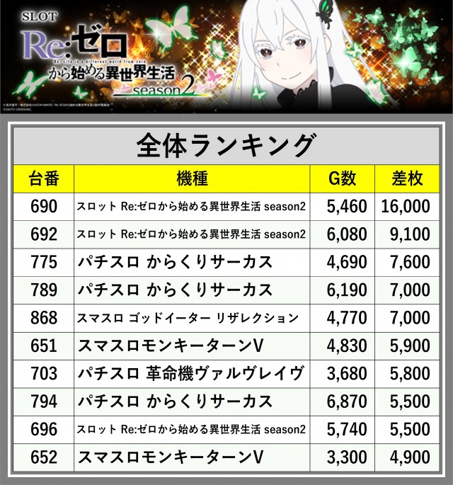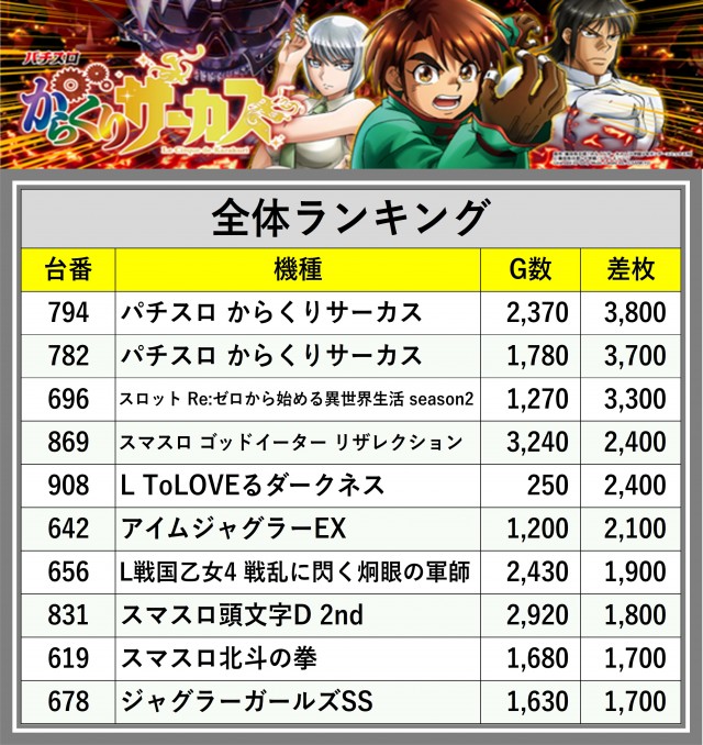 厳選された取材対象機種をはじめ、その他スロット全体から好記録が飛び出した!プレイヤーが楽しんだ1日を下記データにて振り返ってみて欲しい。