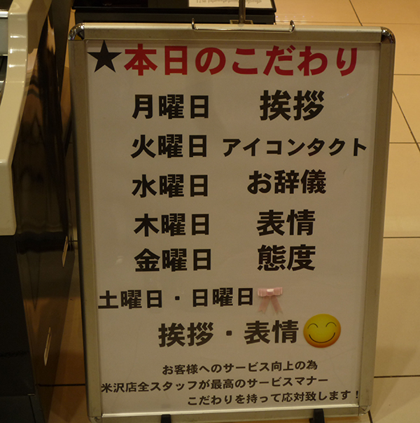 ホール内では、曜日ごとに接客のこだわりを変える取り組みがおこなわれていた。