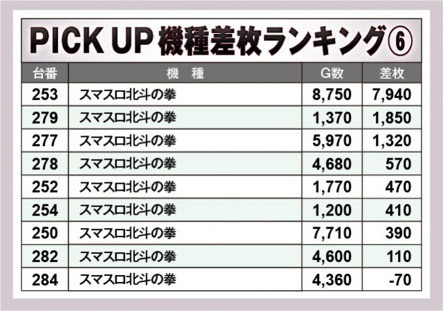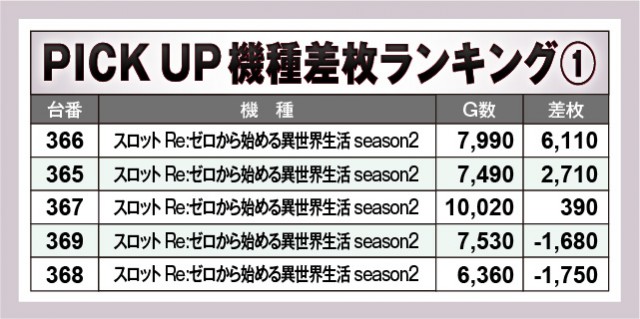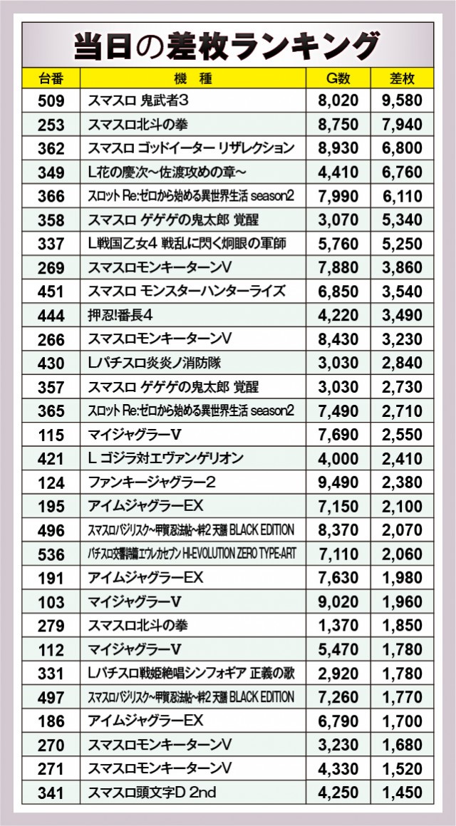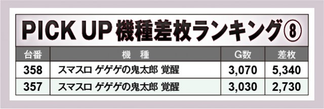 『スロット Re:ゼロから始める異世界生活 season2』や『スマスロ北斗の拳』など、優秀機種から大きな熱気が放たれていたのが何よりも好感を覚えるポイントだ。また『スマスロ ゲゲゲの鬼太郎 覚醒』『Lパチスロ炎炎ノ消防隊』は全台プラス差枚数をマークしており、優秀機種として名に恥じない活躍を披露。『ジャグラー』シリーズの打ち込み具合も鮮烈で、遊技していたファンは満足度の高い1日を過ごせたことだろう。