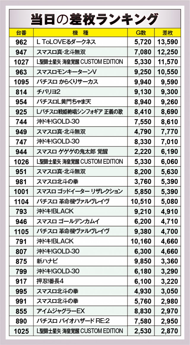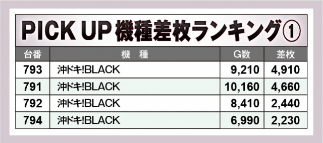 『沖ドキ!BLACK』は全台プラス差枚数を達成しており、回転数と差枚数が比例する展開を披露していたのが鮮烈だ。また同じ沖スロ機種である『チバリヨ2』も9,300枚と大きな熱気を放っており、その盛り上がりぶりは他の島や機種にも伝播していったようだ。