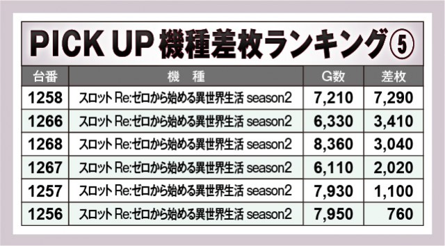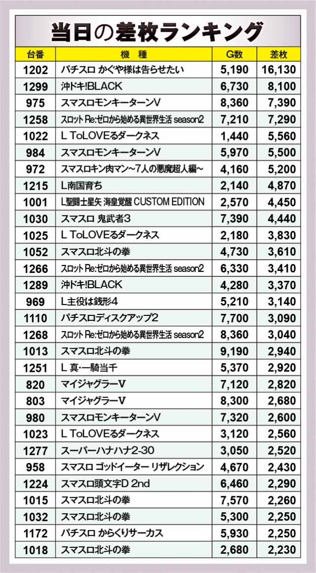 当日は6機種の優秀機種が存在しており、注目の新台『スロット Re:ゼロから始める異世界生活 season2』がさっそく名を連ねている。ファンがじっくりと打ち込んでいた様子が窺える内容で、充実のひと時を過ごせたのではないだろうか。また『スマスロ北斗の拳』『スマスロモンキーターンV』といった人気機種も同様で、これらの中にメダル機『新ハナビ』も名を連ねている事実から、同店の高い実力を感じずにはいられない。