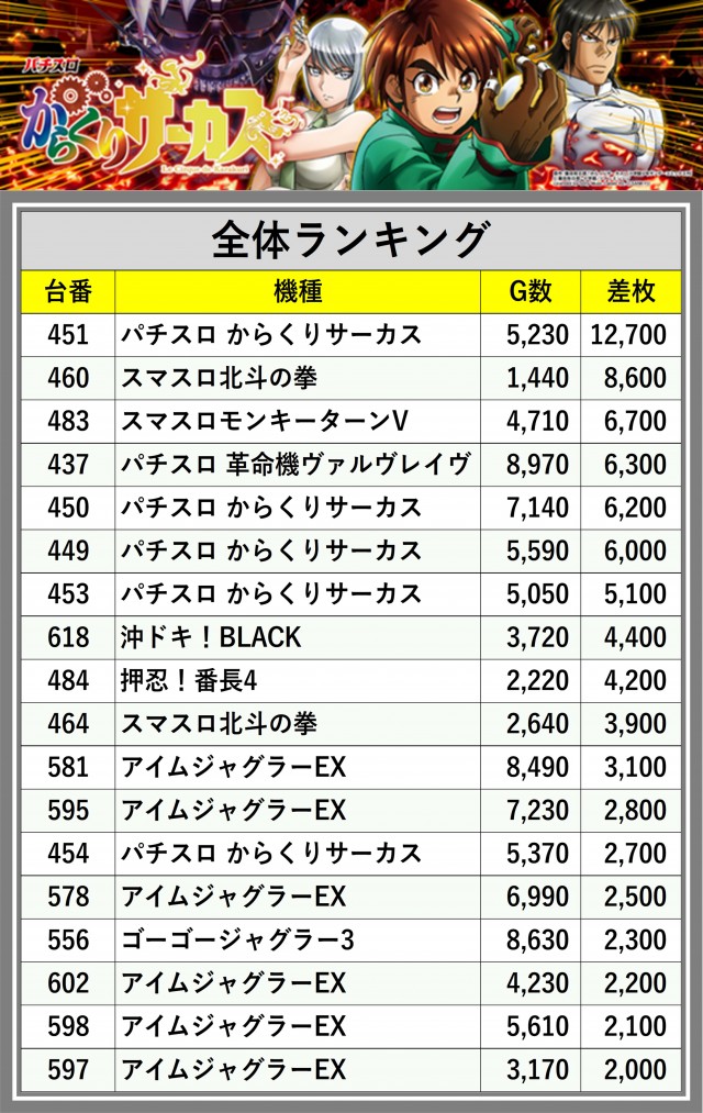 厳選された取材対象機種をはじめ、その他スロット全体から好記録が飛び出した!プレイヤーが楽しんだ1日を下記データにて振り返ってみて欲しい。