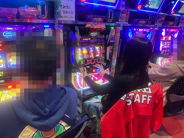 まわりのお客さまが笑顔で遊技をおこなっているなかで、エリカちゃんも奮闘!!