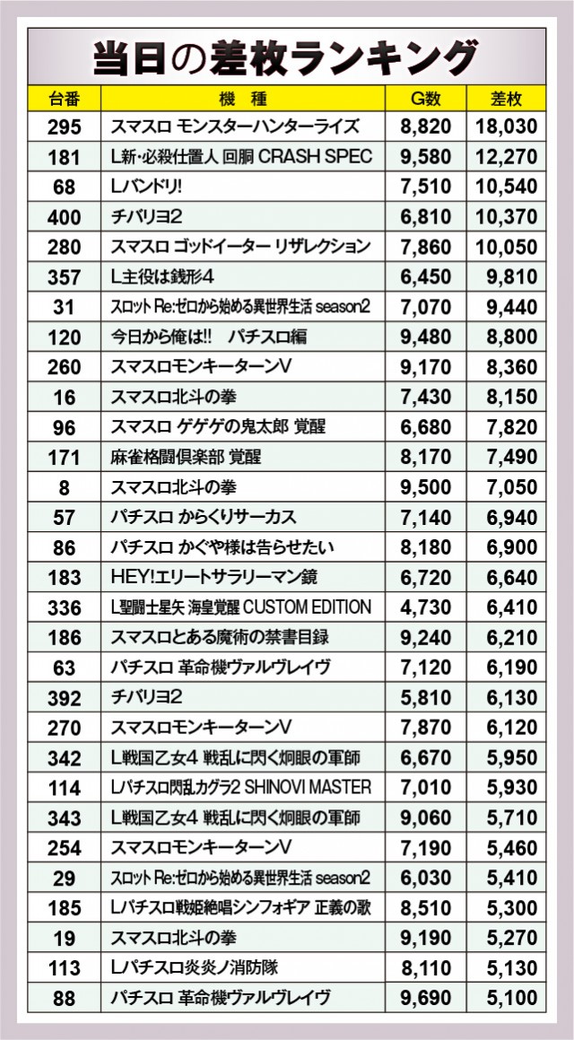 『スマスロ モンスターハンターライズ』『L新・必殺仕置人 回胴 CRASH SPEC』『Lバンドリ!』『チバリヨ2』『スマスロ ゴッドイーター リザレクション』から万回転OVERが生まれており、当日の店内の盛り上がりをリード。さらに8~9,000枚OVERも多く、上表だけで5,000枚OVERとなっている点から、凄まじい熱気だったと窺える。8~9,000回転台をマークした台の多さからも、手ごたえのほどを読み取れるはずだ。