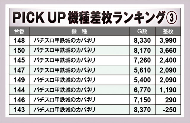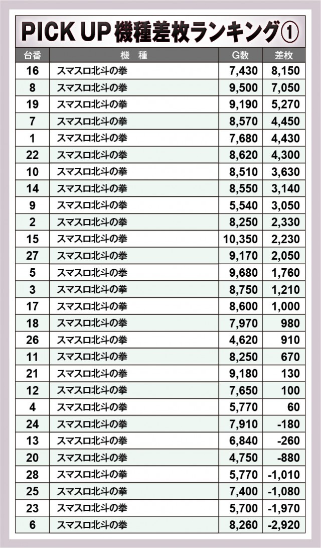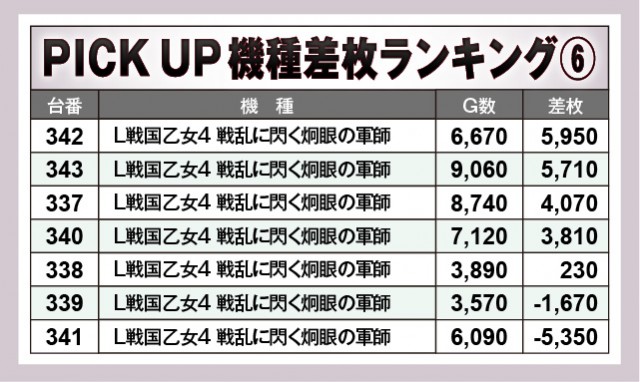 前日に引き続き『スマスロ北斗の拳』が活躍しており、万回転OVERを筆頭に閉店までじっくりと打ち込まれた。さらに熱気も伴っており、遊技していたファンは拳に力が入ったことだろう。また『L戦国乙女4 戦乱に閃く炯眼の軍師』から大台突破台を確認でき、メダル機ながら『パチスロ甲鉄城のカバネリ』『パチスロ ガメラ2』も気を吐くなど、優秀機種の活躍が目立っていたとい言える。