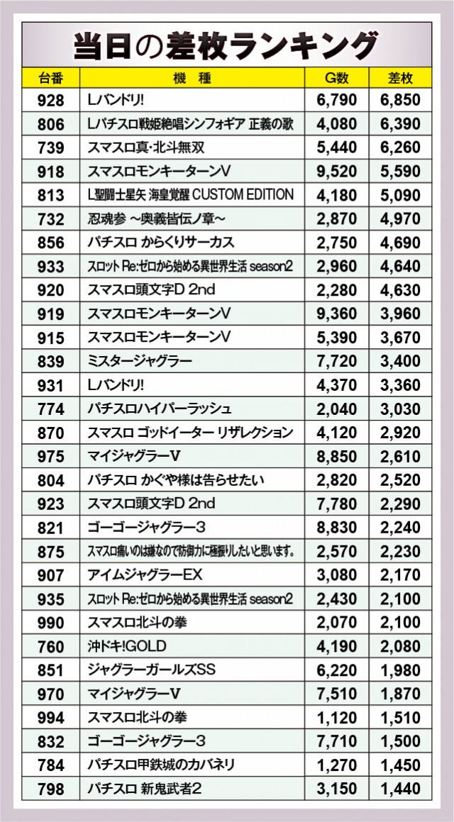 上表の優秀機種はいずれも大きなマイナスが見られず、好感触を得られるエリアとなっていたようだ。『スマスロモンキーターンV』が顕著で、『マイジャグラーⅤ』『ゴーゴージャグラー3』もコンスタントに大当りを射止めていたと言える。その中で『Lバンドリ!』『Lパチスロ戦姫絶唱シンフォギア 正義の歌』は大きな熱気を放っており、盛り上がりの中心になっていたのは確かだ。