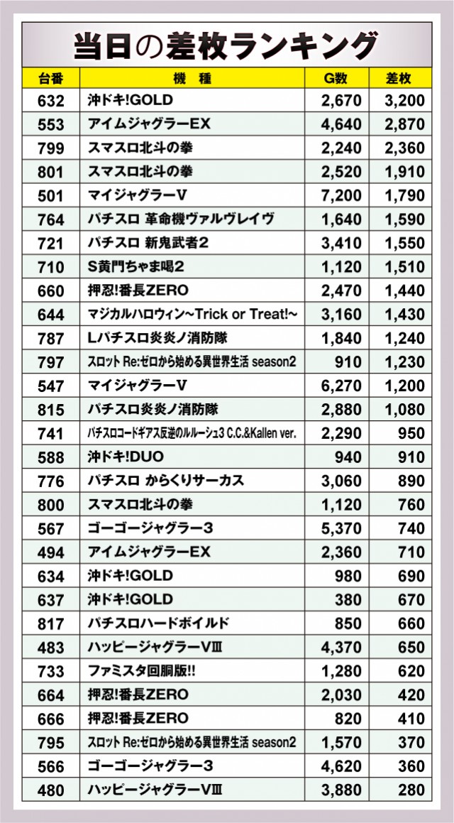 気になる初実施の内容はコチラ。やはり初めてだからだろうか。差枚数としては突き抜けているデータは見られなかったが、その中でもしっかりと稼働している台も中にはある。それがジャグラーシリーズだ。